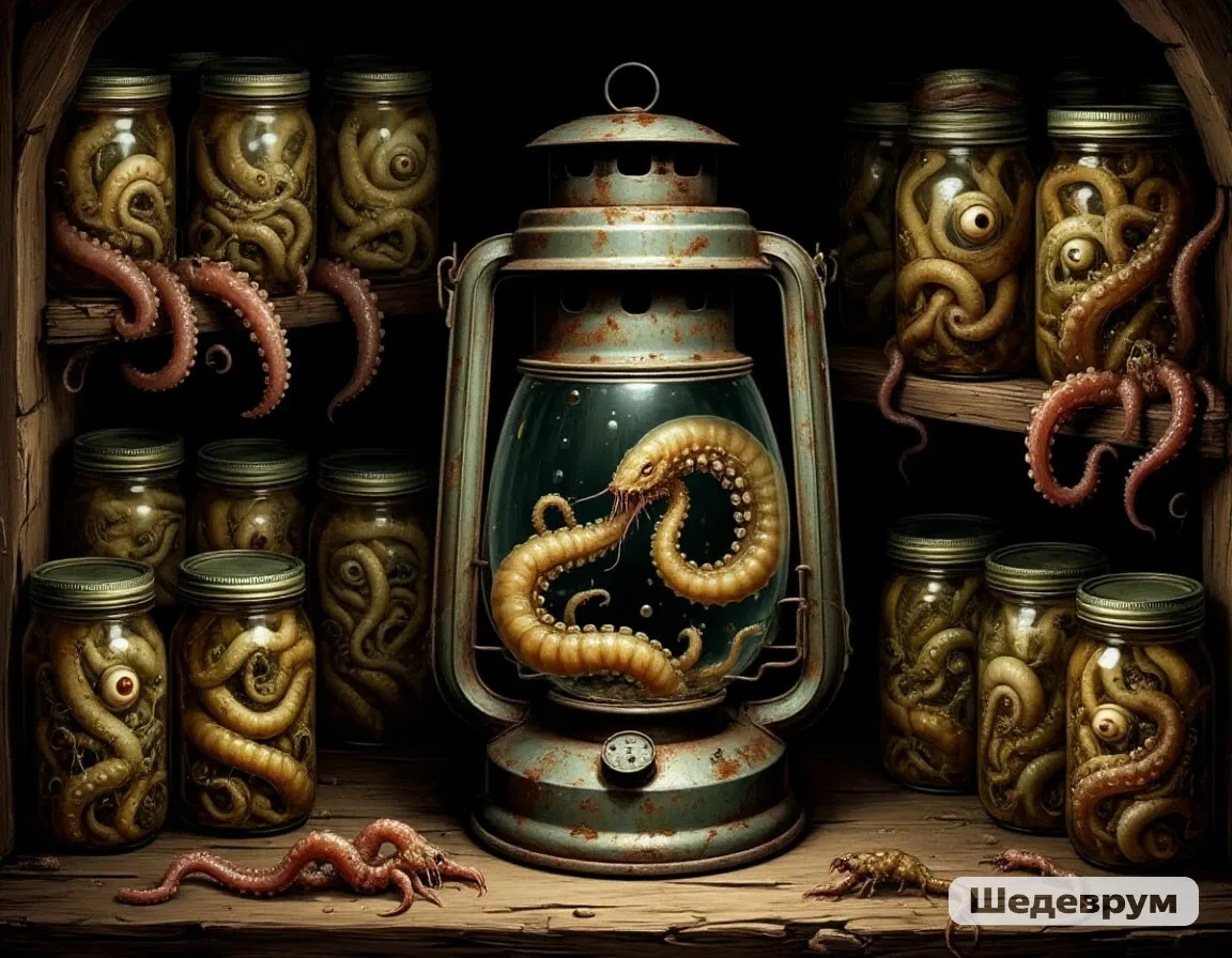 В подвале было темно. Я зажег фонарь, и его свет выхватил из мрака полки с банками. В некоторых плавали заспиртованные существа: когтистые лапы, щупальца, глаза на стебельках. Один из сосудов треснул, и из него выползло нечто, похожее на червя с человеческими зубами. Оно зашипело и скрылось в щели.
