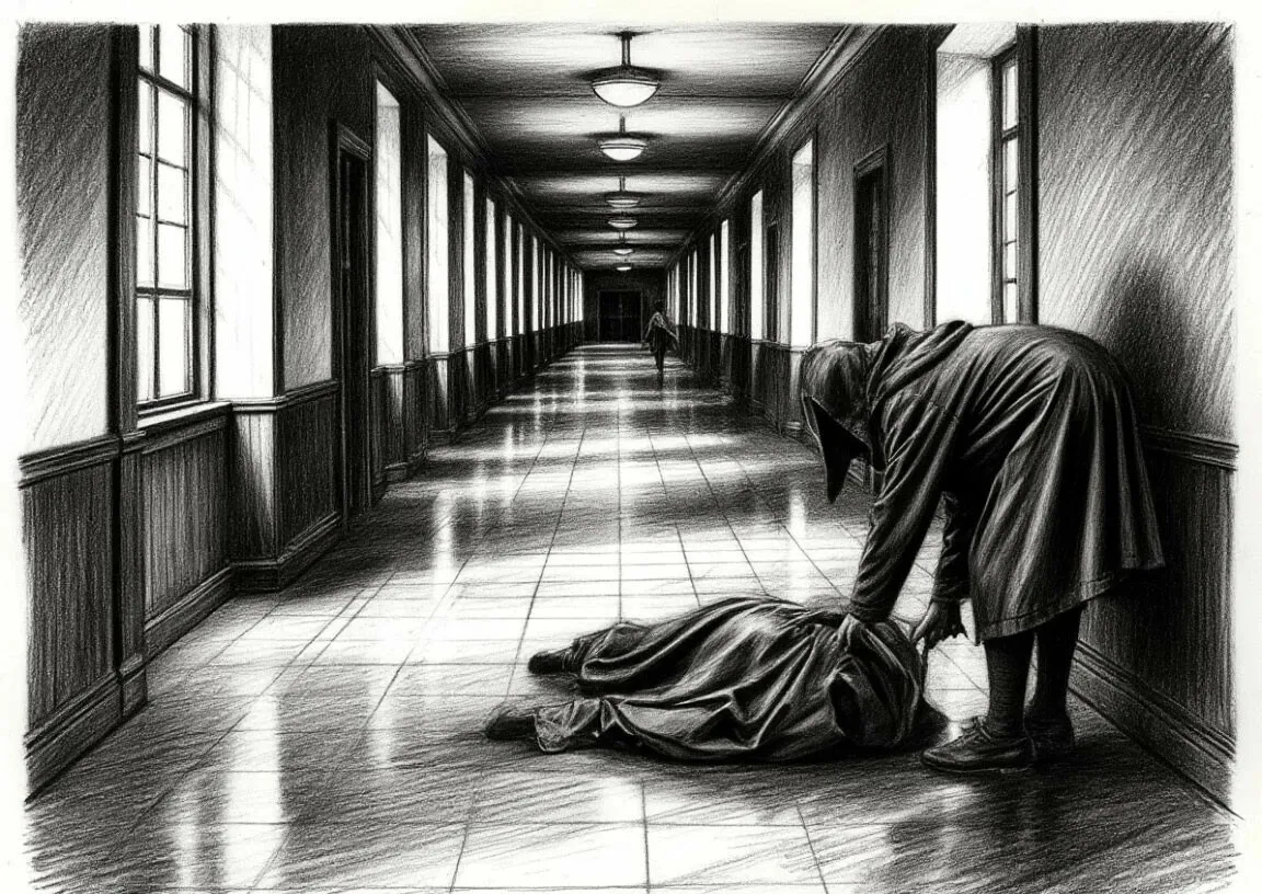 Мистер Грей счёл это подростковой фантазией, мрачной шуткой. Но на следующий день в том самом коридоре нашли без сознания уборщика мистера Холла — у него случился сердечный приступ. Рядом валялась опрокинутая тележка с вёдрами, отбрасывавшая длинные тени.