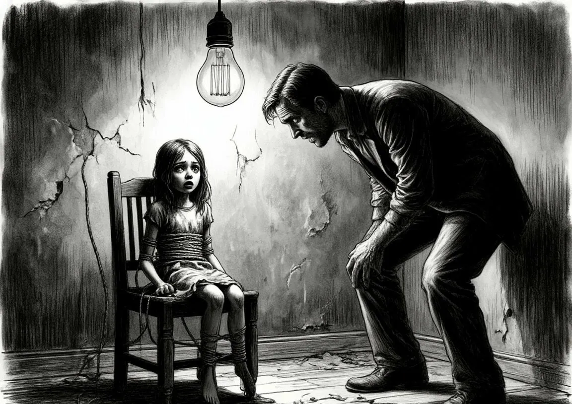 Из подвала донёсся слабый крик. Волков бросился вниз. В тусклом свете лампочки он увидел девочку лет семи, привязанную к стулу. Её глаза были полны ужаса.