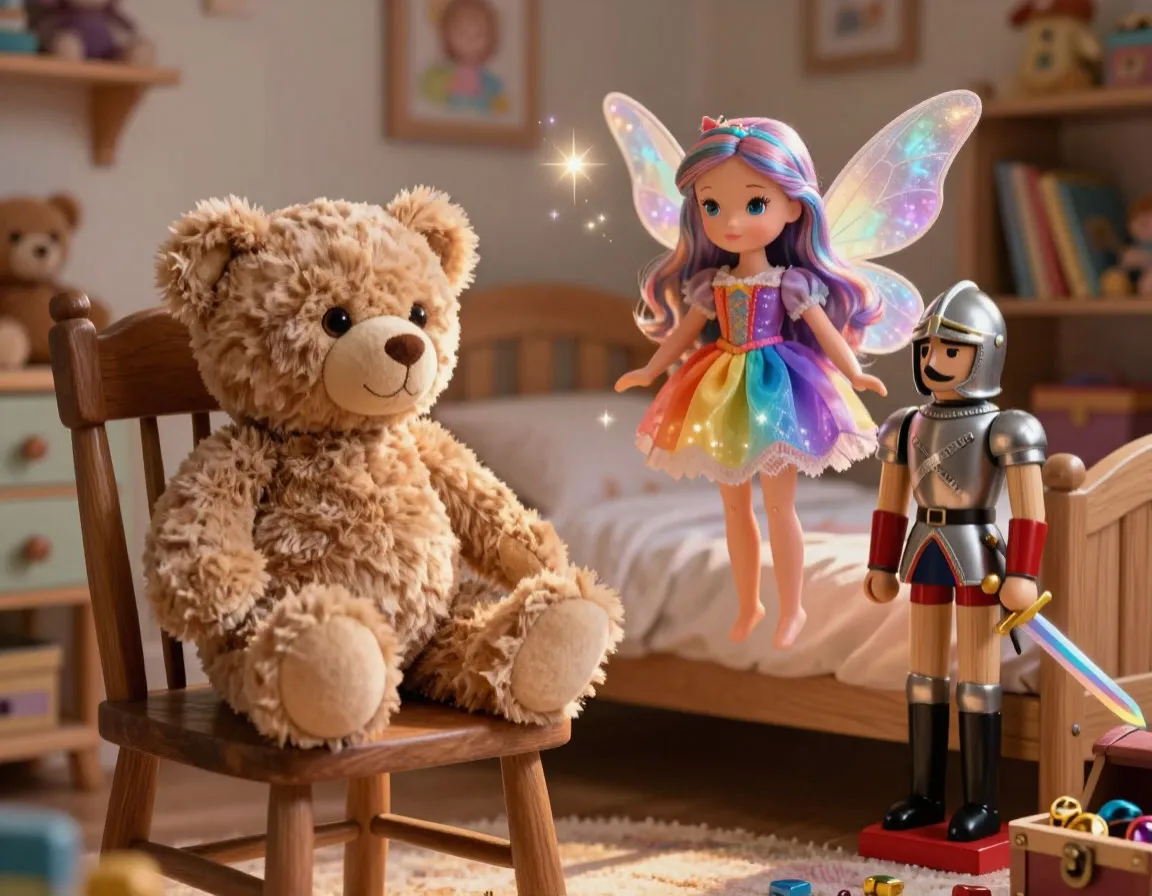 В детской комнате на полке жили разные игрушки: плюшевый мишка по имени Барни, кукла Алиса с длинными золотистыми волосами, красная машинка с блестящими колёсами и старый деревянный солдатик. Днём они стояли неподвижно, а по ночам — оживали и разговаривали друг с другом.