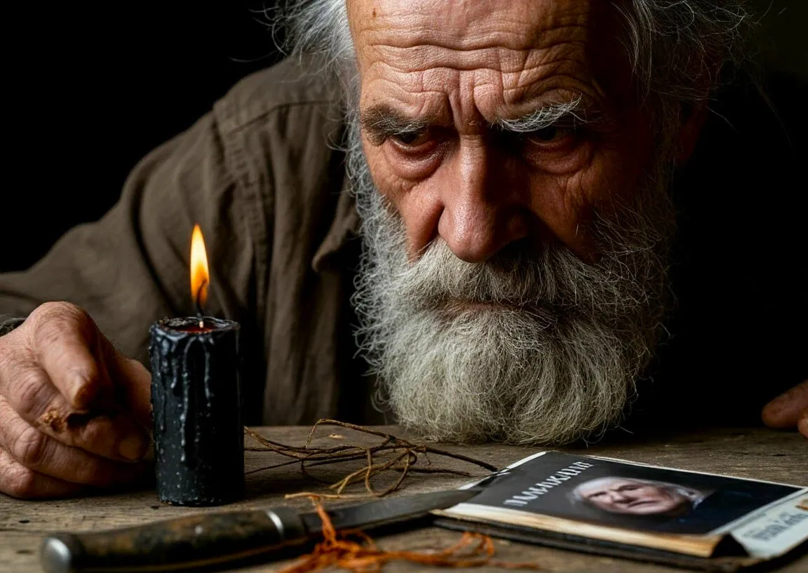 Старик разложил на столе прядь волос Сергея, фотографию Марины, чёрную восковую свечу и маленький ржавый нож. Лезвие покрывали странные насечки, напоминающие письмена.