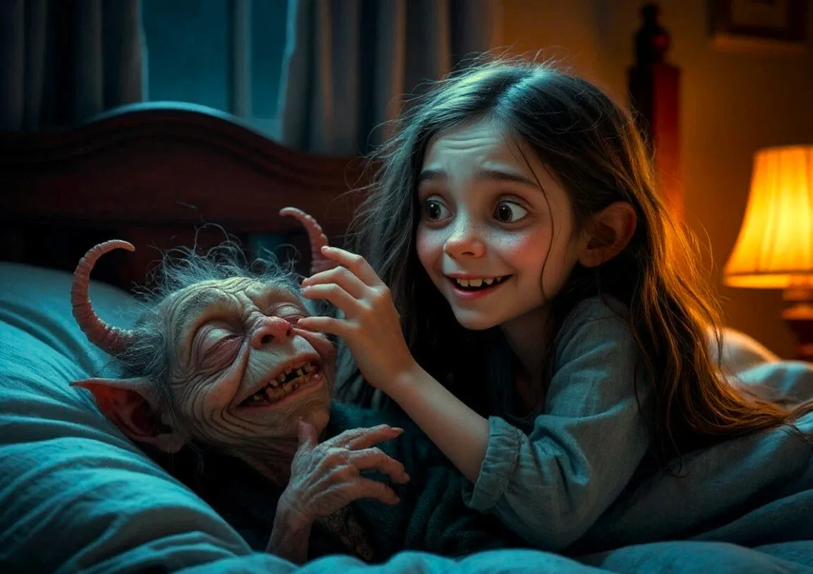 Ночью Лиза проснулась от того, что кто‑то гладил её по волосам. Она открыла глаза и увидела рядом с кроватью маленькое существо с длинными пальцами и морщинистым лицом. Оно улыбалось беззубым ртом.