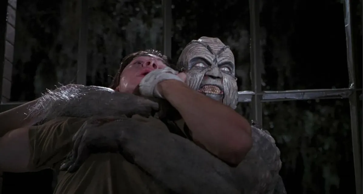 Триш побледнела: «Это сейчас. 2024 год — ровно 23 года». Они услышали шум снаружи — крылья, хлопающие в воздухе, как огромная летучая мышь. Дэрри выглянул в окно: над полем парила фигура — крылатая, с кожистыми перепонками, испещрёнными венами. Монстр, известный как Крипер, спустился на землю, его глаза горели жёлтым светом, а рот растянулся в ухмылке, обнажая острые зубы. Он нюхал воздух, словно чуя их страх.