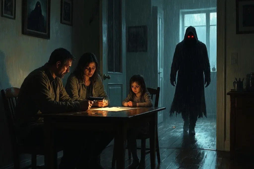 Он сидел в темноте, прижимая к себе жену и дочь. На столе лежал пистолет. За окном лил дождь.