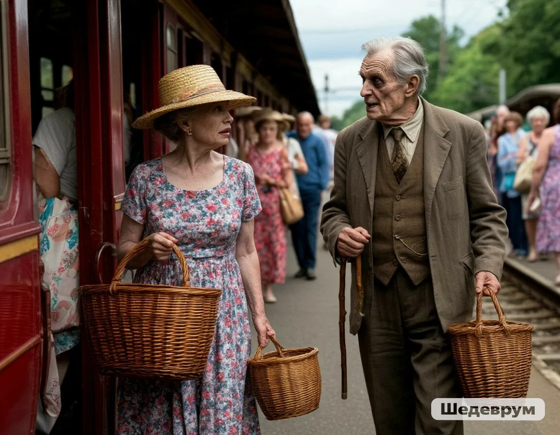 Но что-то изменилось, когда электричка остановилась на очередной станции. В вагон вошла толпа дачников — с корзинами, сумками, в широкополых шляпах. Среди них были и пожилые люди: бабушка в цветастом платье и высокий, сутулый дед с тростью. Они сели напротив Максима.