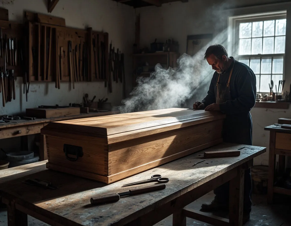 Она подошла к верстаку и похолодела. На нём лежал недоделанный гроб — грубо сколоченный, из тёмного дерева, с неровными краями. Рядом — записка, написанная корявым, будто детским почерком: «Для тебя».