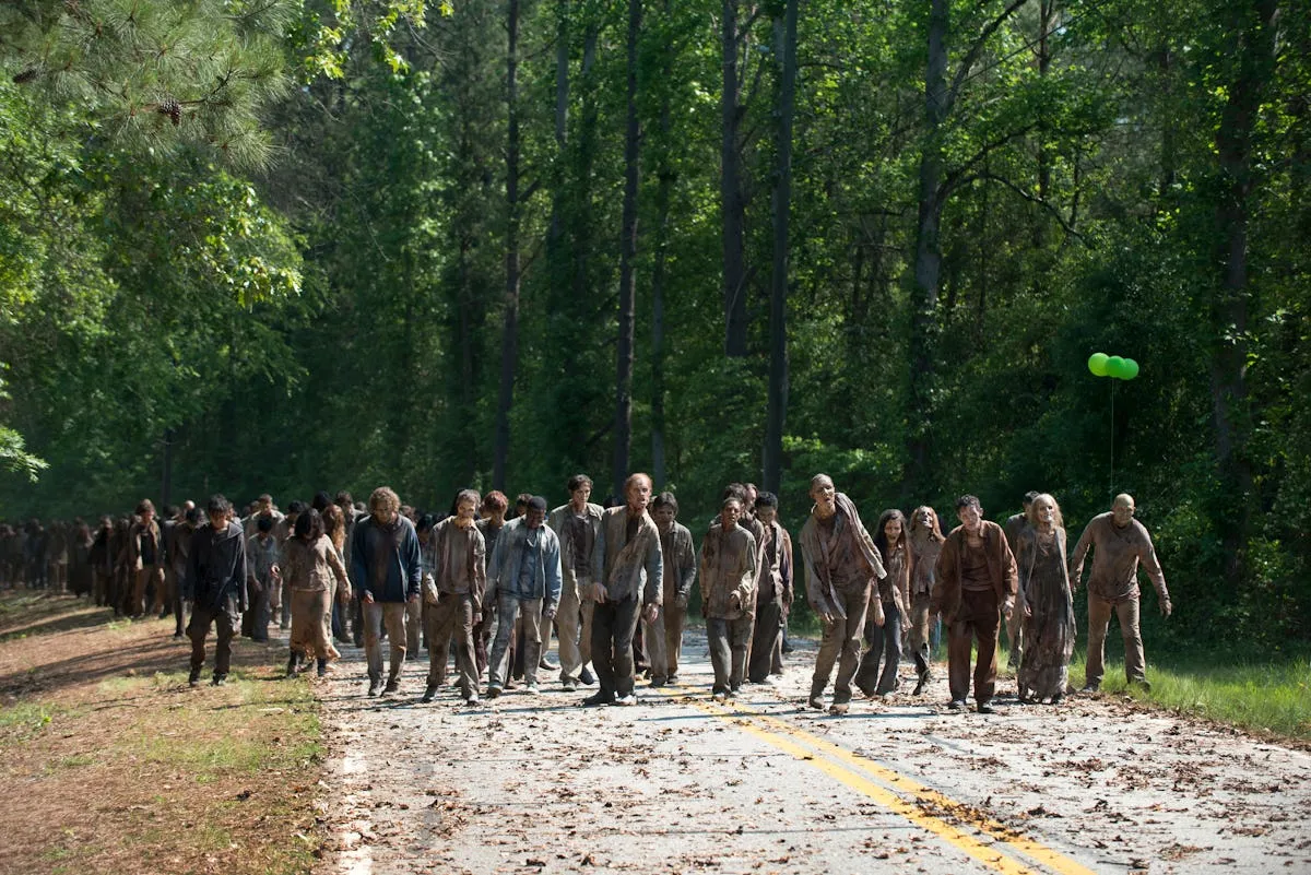 Рик, Лори и Карл бежали из города на старом пикапе. Дороги были забиты брошенными машинами, а в воздухе витал запах гнили. «Папа, что с ними?» — спросил Карл, глядя на толпу мертвецов, тянущих руки через окна.