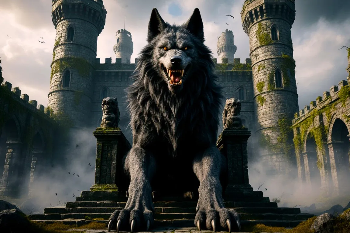 Михей Семёнович прошел по длинному коридору, заглядывая в комнаты. В одной из них, некогда, видимо, парадной зале, он увидел нечто, от чего кровь застыла в жилах. В центре комнаты, на высоком троне, сидело существо. Оно было огромным, покрытым жесткой черной шерстью, с длинными когтистыми лапами и головой, напоминающей голову волка, но с человеческими, пронзительными глазами. Из пасти торчали острые клыки.
