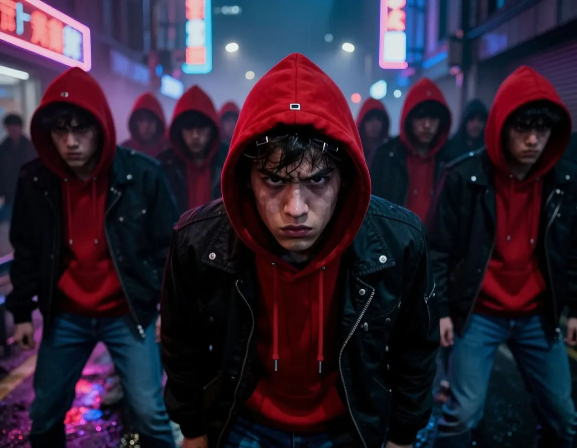 Тишина. Подростки замерли. Лидер банды, в красной куртке, прищурился.