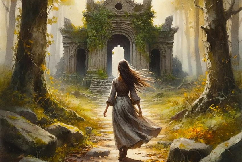 Следующим шагом стало путешествие к руинам древнего храма, расположенного за пределами города, в густом лесу, где, по слухам, обитали духи и древние существа. Лира, никогда не покидавшая город, чувствовала одновременно страх и волнение. Но рядом с Калебом, чье спокойствие и мудрость были незыблемы, она ощущала себя сильнее. Её кисть, прежде танцевавшая по холсту, теперь должна была танцевать по самой реальности, рисуя путь к спасению города.