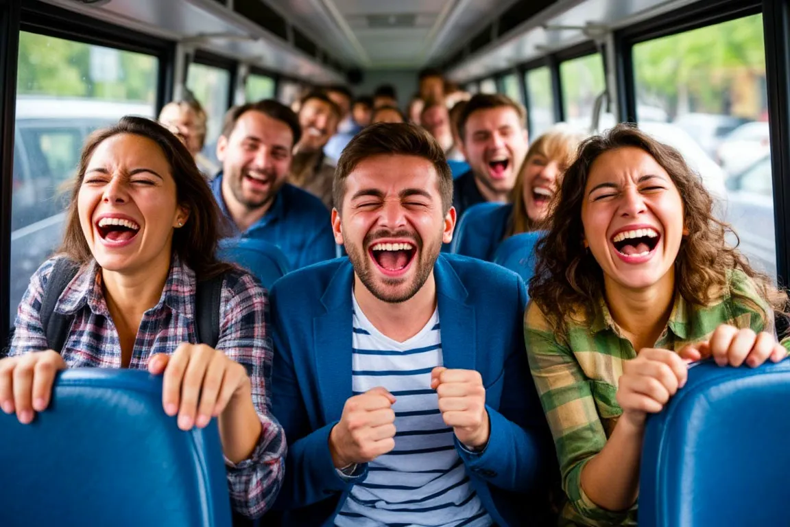 Маршрутка взрывается. Люди хватаются за животы, кто‑то давится смехом, парень становится пунцовее светофора: