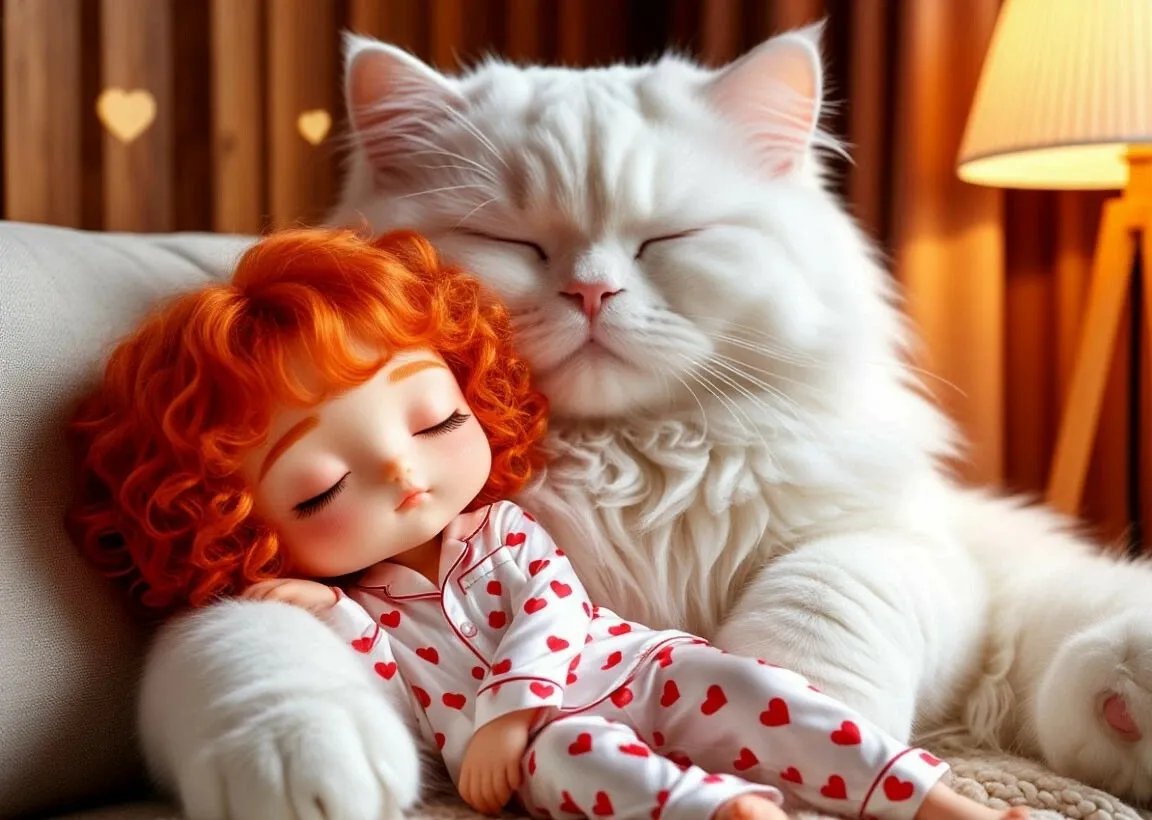 Девочка укуталась в свой белый вязаный плед, который теперь казался крошечным на фоне гигантского кота. Она положила голову на его пушистую грудь и закрыла глаза. Тёплый уютный свет от торшера создавал на стенах причудливые тени, напоминающие сказочных существ.
