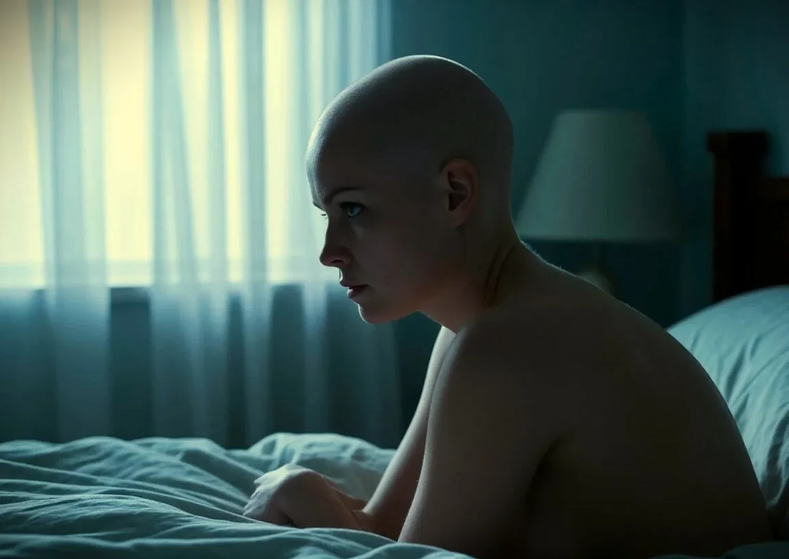Он замер, потом медленно поворачивает голову к краю кровати. Там, у его ног, сидит кто-то. Силуэт женщины, совершенно лысой, с неестественно гладкой кожей. Она не шевелится, просто смотрит на него пустыми глазами.