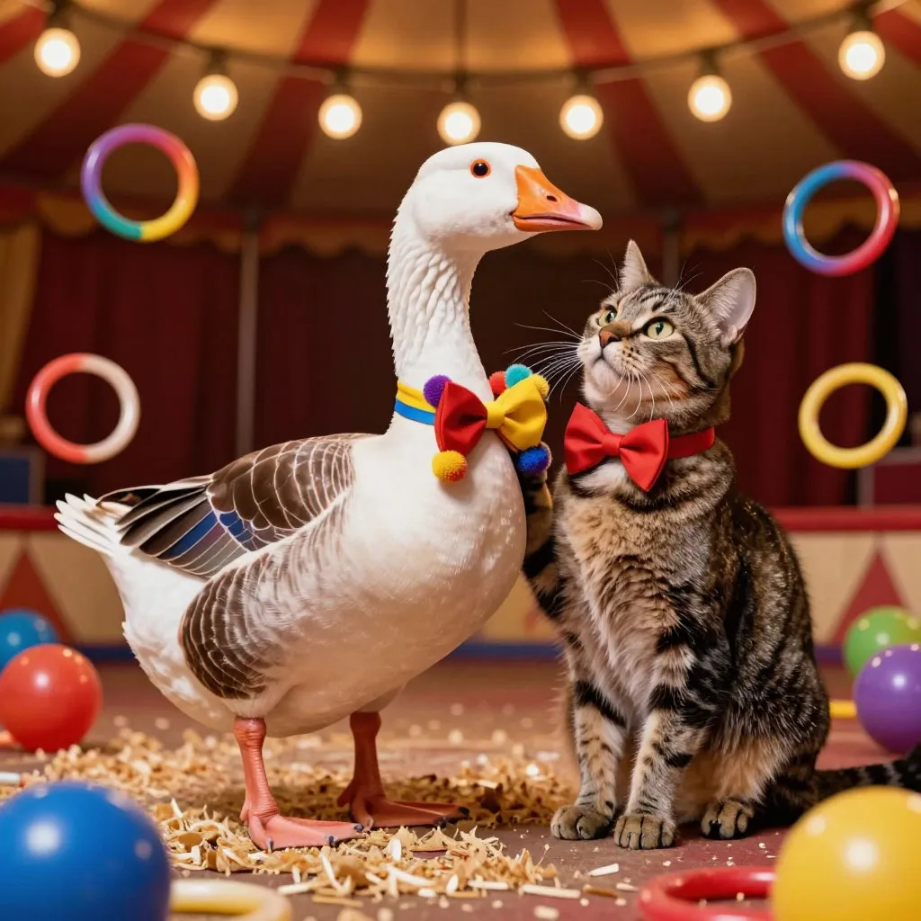 Когда пыль улеглась, Мурка и Гусик стояли посреди площади, тяжело дыша, но сияя от радости. Они обнялись — пушистая кошечка и величественный огнедышащий гусь.