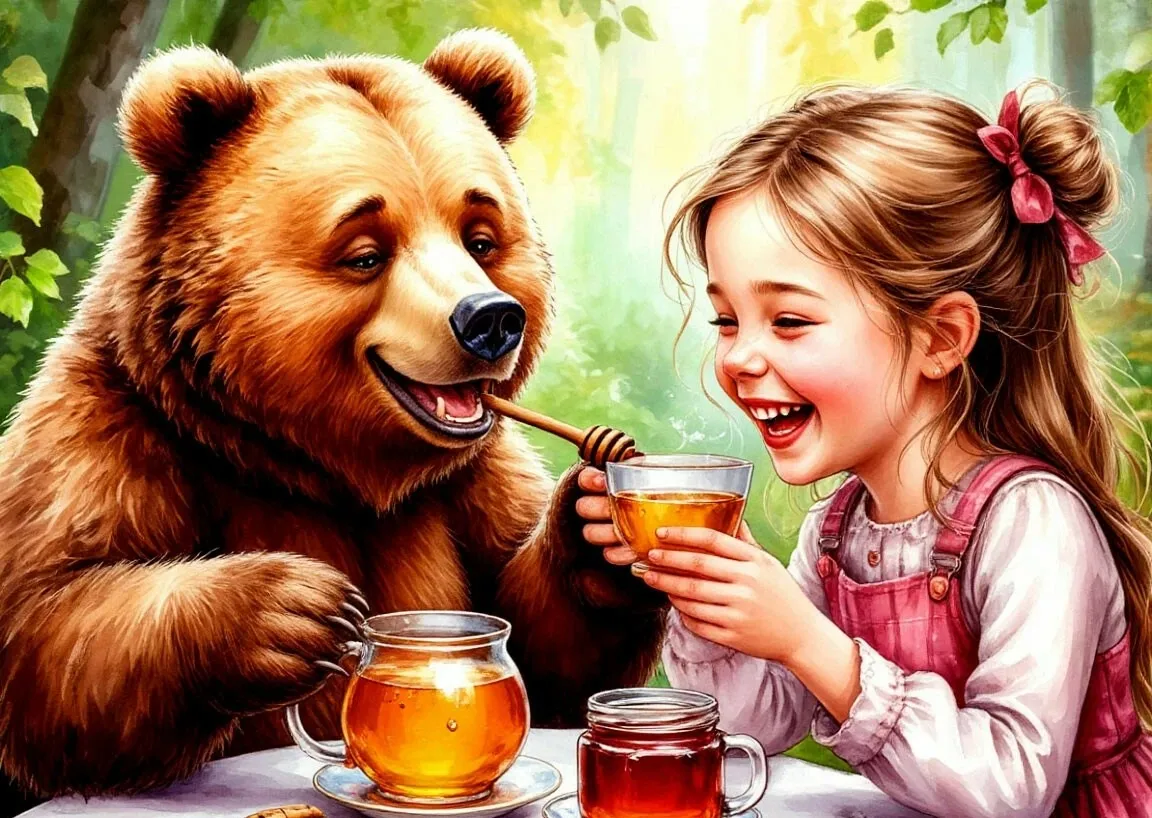 А если пройти по тропинке к старой избушке, можно услышать, как медведь и девочка смеются, пьют чай с мёдом и строят планы на следующее приключение.