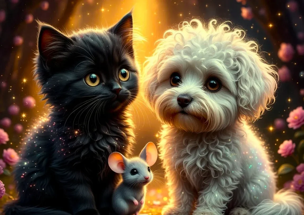В одном уютном домике на краю леса жили трое друзей: чёрная кошка по имени Ночка, белая кудрявая собачка Пушок и маленькая серая мышка Шустрик. Хотя в сказках кошки обычно гоняются за мышами, а собаки лают на кошек, эти трое были неразлучны. Они познакомились ещё малышами и с тех пор всё делали вместе.