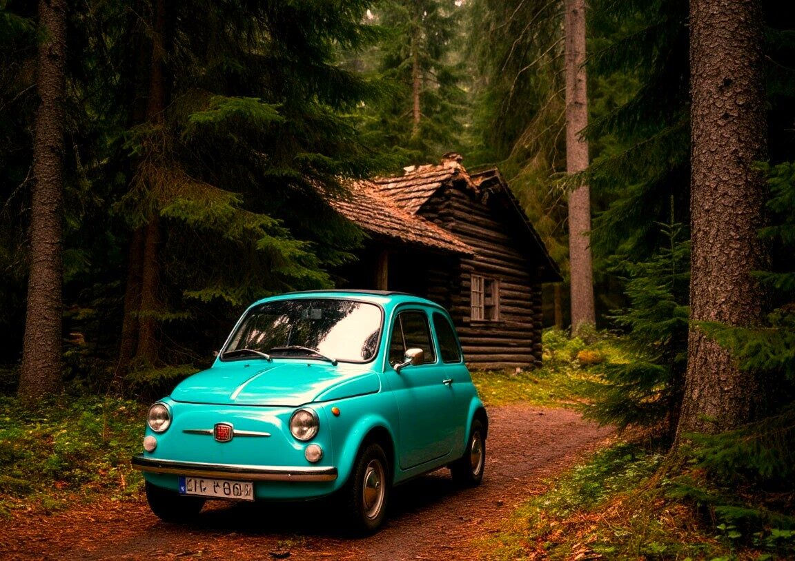 Бирюзовый Fiat 500 затормозил у опушки мрачного ельника, на краю которого стоял старый бревенчатый дом. К дому не вело ни одной дороги — лишь узкая, едва заметная тропа, будто протоптанная не людьми, а лесными зверями. Ветви старых елей сплетались над ней, образуя тёмный свод, сквозь который почти не пробивался солнечный свет. Воздух здесь был тяжёлым, пропитанным запахом прелой хвои, сырости и чего‑то ещё — едва уловимого, тревожного, будто сама земля здесь дышала с трудом.