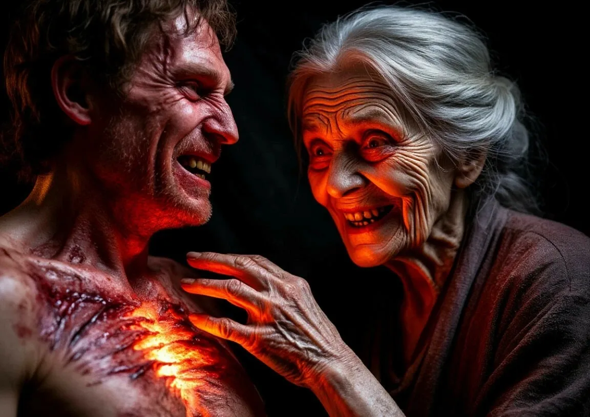 Лицо Забавы менялось: бледность сменилась румянцем, кожа засветилась изнутри. Герой с ужасом увидел, как его собственная рука стареет на глазах. Она улыбнулась — сверкнули острые зубы. Палец провёл по груди героя, оставив жгучий след. Волосы сжимались, выдавливая воздух из лёгких.