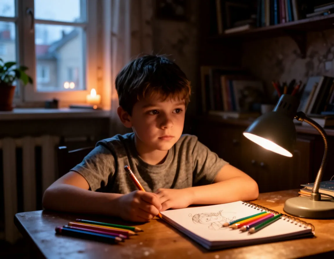Город засыпал под шум дождя. Капли стучали по крышам, стекали по стёклам, размывая огни уличных фонарей. В маленькой квартирке на пятом этаже старого дома горел тусклый свет. За столом сидел мальчик лет десяти — Максим. Перед ним лежали цветные карандаши и альбом для рисования. Но рука не поднималась сделать хоть один штрих.