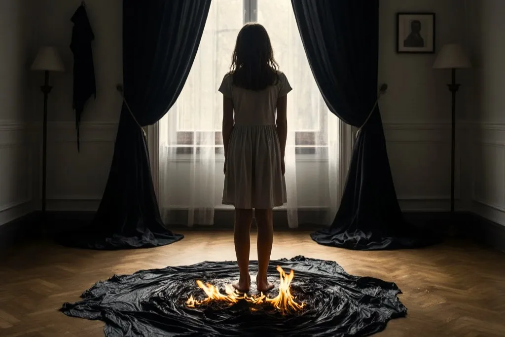 Когда пожарные ворвались в дом, всё было кончено. На полу лежала девочка с обожжёнными глазами, а вокруг неё догорали чёрные шторы — последние свидетели проклятия, которое никто не захотел услышать вовремя.
