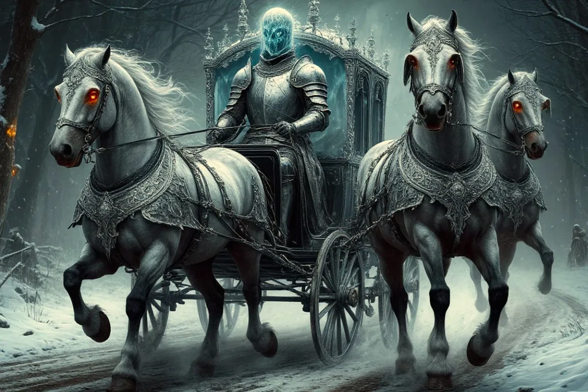 Вдруг, коней охватила паника. Они взвились на дыбы, их пронзительные ржания разорвали тишину ночи. Перед каретой, словно сотканный из лунного света и тумана, появился призрачный всадник. Его серебряная броня отливала холодным блеском, а глаза горели ледяным огнем. Петр попытался взмолиться, но звуки застряли в горле, словно сам воздух превратился в лед.