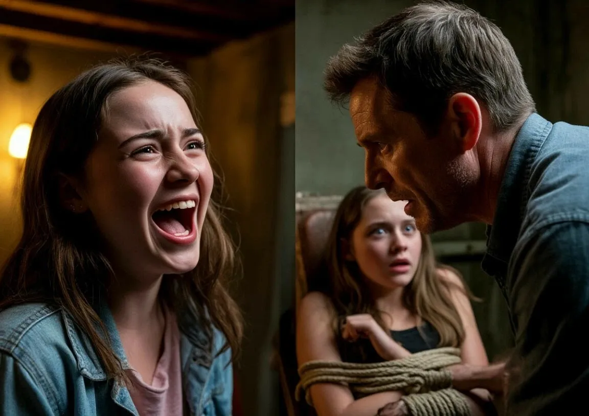 Дальше — комната, похожая на подвал. Девушка привязана к стулу. Мужчина наклоняется к ней, шепчет что‑то на ухо. Камера приближается к его лицу — и я наконец вижу то, что раньше упускал.