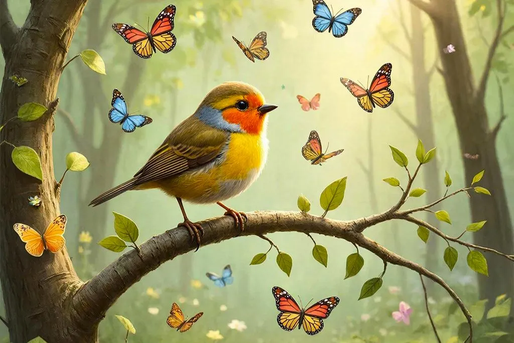 В густом лесу, где пели птицы, жила маленькая птичка по имени Чирик. Все ее братья и сестры пели красивые песни, но Чирик никак не мог научиться петь. Когда он пытался, из его клюва вылетали только странные звуки.