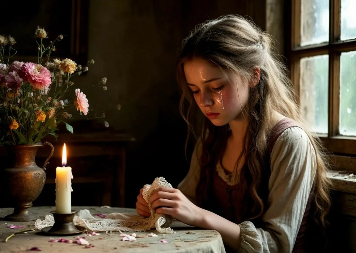 Тишина. Свеча догорает на старом столе. В комнате пахнет ладаном и увядающими цветами. Козетта сидит у окна, её пальцы сжимают платок. Слезы катятся по щекам, но она не вытирает их.