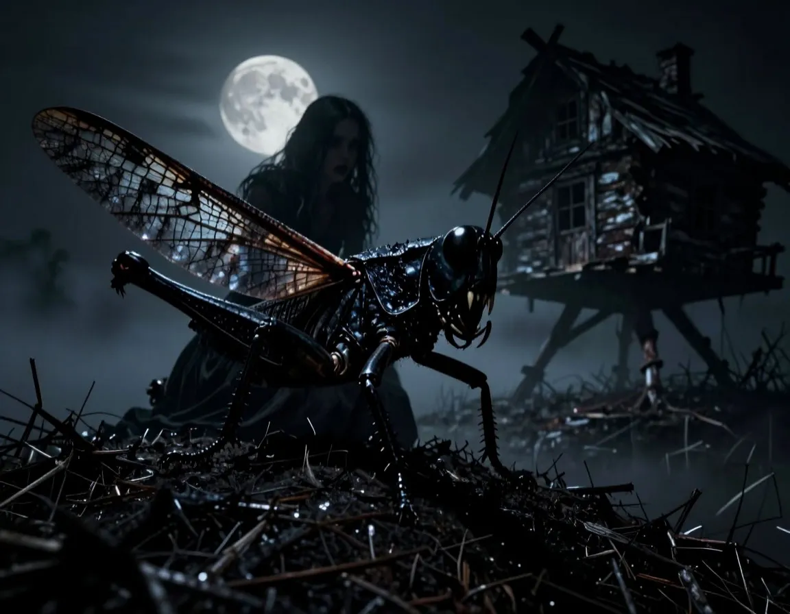 Саранча обрушилась на деревню, как чёрная волна. Она билась в окна, залетала в щели, покрывала крыши шевелящимся ковром. Её запах — резкий, химический — проникал повсюду, смешиваясь с запахом пота и страха.