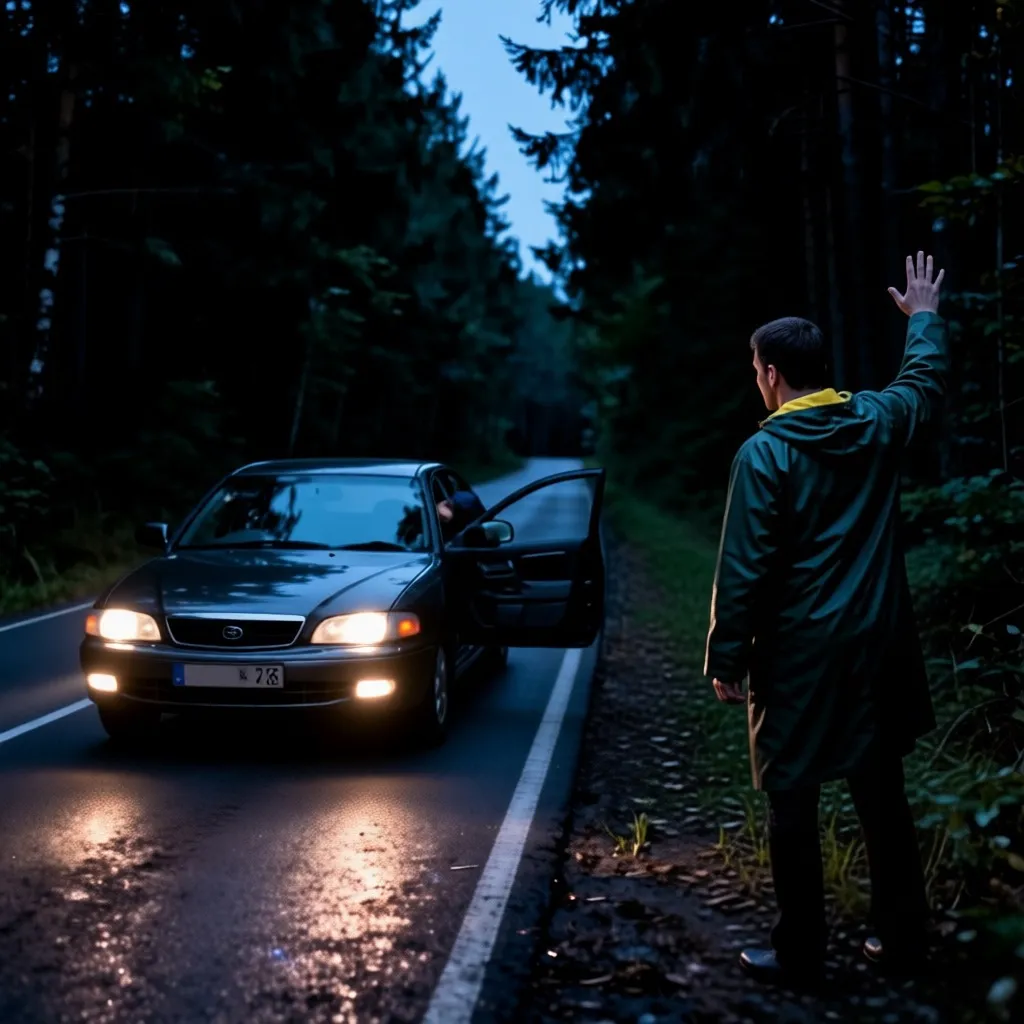 Марк ехал по старой дороге через лес. Было уже поздно, и фары выхватывали из темноты лишь узкий участок асфальта. Вдруг он заметил на обочине фигуру в плаще. Человек поднял руку, прося подвезти.