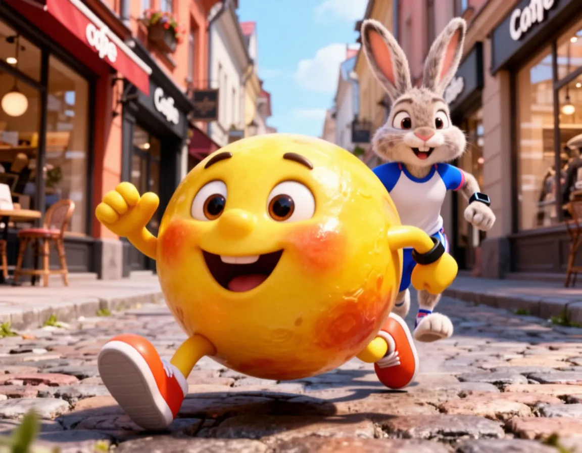 Катится колобок по тротуару, мимо модных кофеен и бутиков, а навстречу ему — заяц в спортивной форме, с фитнес‑браслетом на лапе.