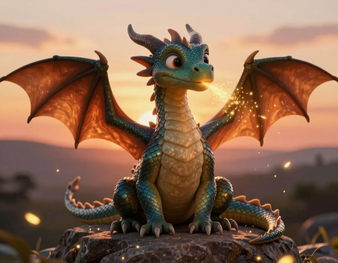 В далёкой долине, за высокими горами и густыми лесами, жил дракон по имени Огонёк. Он был совсем не похож на тех грозных драконов, о которых рассказывали в страшных сказках. У Огонька была золотистая чешуя с алыми переливами, большие добрые глаза и сердце, полное тепла.
