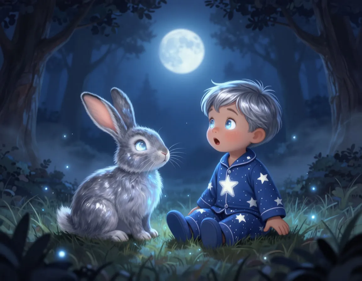 В этот момент из‑за шкафа выглянул маленький серебристый кролик с длинными ушами и глазами, похожими на две яркие луны. Он робко улыбнулся Тимке и подошёл ближе.
