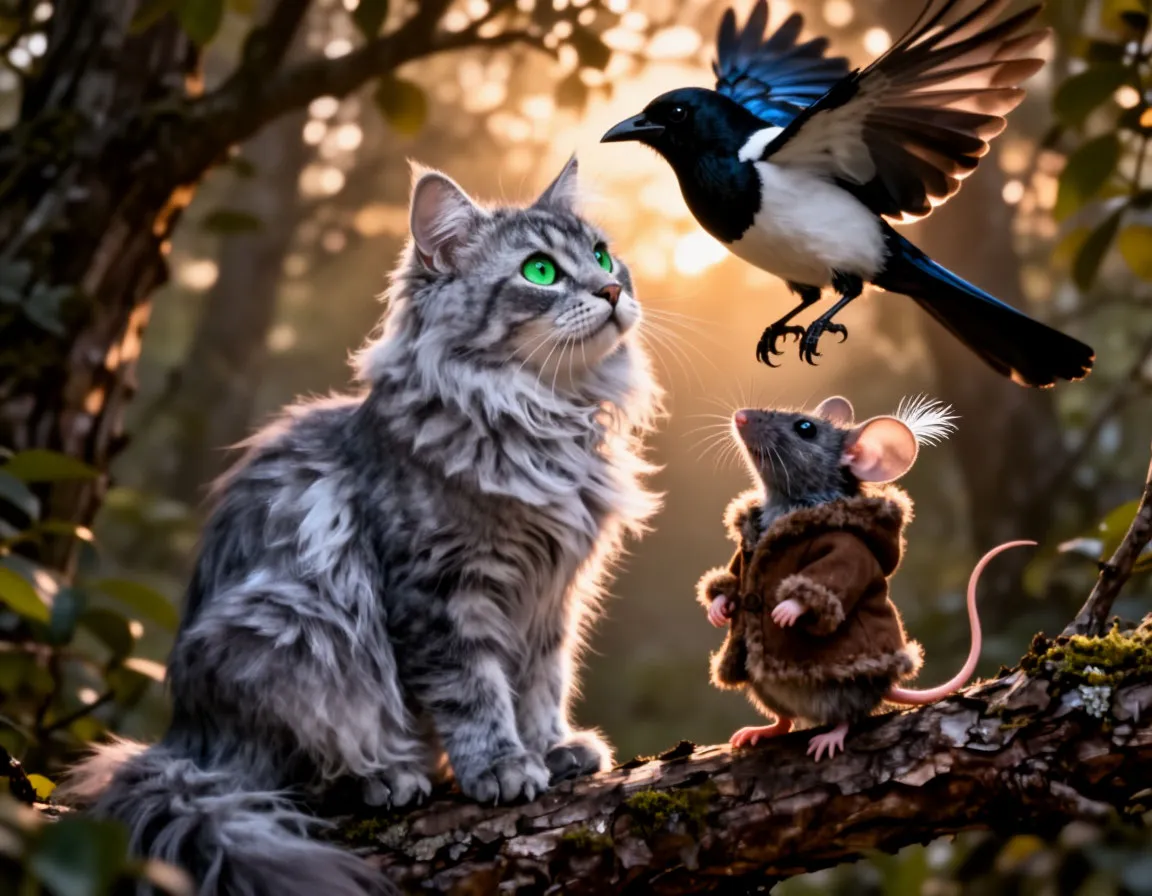 Мурликс был необычным котом: его серая шерсть переливалась, словно утренний туман, а глаза светились мягким золотистым светом. Он умел творить маленькие чудеса — мог заставить цветок распуститься одним прикосновением лапы или создать крошечный огонёк, который танцевал в воздухе, как светлячок. Но самое главное — Мурликс дал клятву никогда не охотиться на мышей, и потому Пикс совершенно его не боялся.