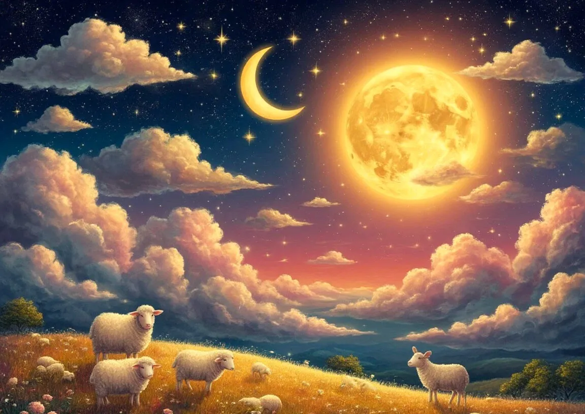Рядом с Луной, прямо среди облаков, жили маленькие белые пушистые кудрявые овечки. Их шерсть была такой мягкой и кудрявой, что, когда они бегали по небу, за ними оставались лёгкие завитки облаков. Овечки очень любили Луну и часто приходили к ней поболтать.