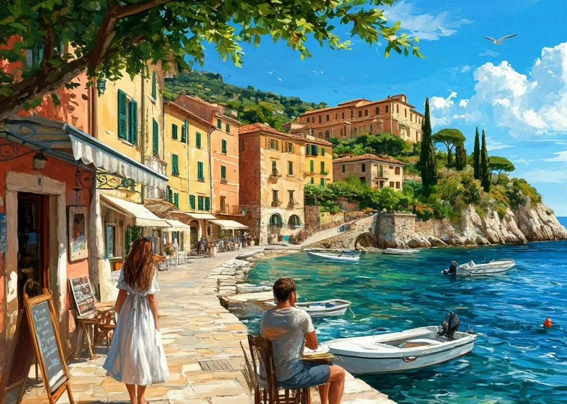 Сан‑Марина раскинулся перед ней, словно сошедший с открытки: терракотовые крыши, пастельные фасады домов, увитые бугенвиллией балконы. Узкие улочки сбегали к морю, где лазурные волны разбивались о камни, рассыпаясь брызгами, похожими на бриллианты.