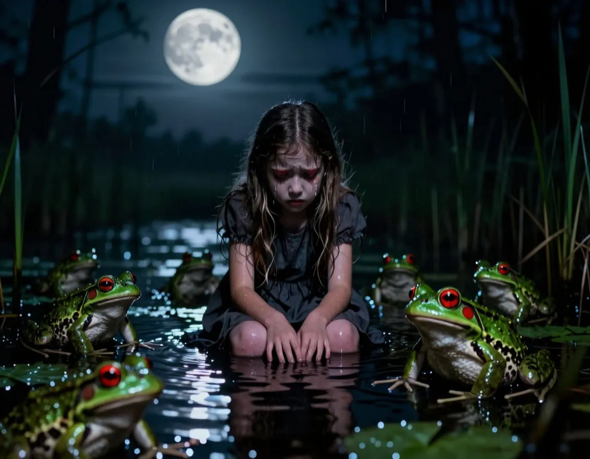 Мама выбежала следом. Она бежала за дочерью через деревню, мимо тёмных домов, к болоту. Луна освещала путь призрачным светом, а где-то впереди она видела маленькую фигурку, которая двигалась не как ребёнок, а как… лягушка.