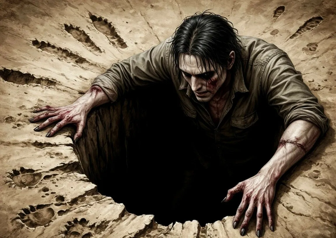 Голос шёл из‑под земли. Что‑то зашевелилось под слоем листьев. Охотник вжался в стенку, когда из ямы начали вылезать руки — бледные, длинные, с чёрными ногтями. Они тянулись к нему и шептали: «Ты теперь мой».