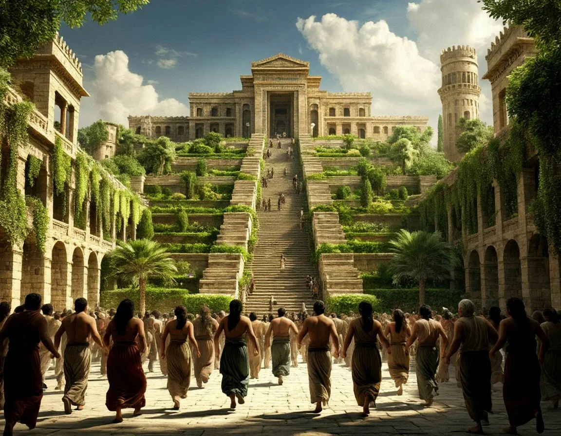 Царь стоял на верхней террасе и смотрел вниз, на каскад зелёных уровней, спускающихся к земле. Пальмы шелестели листьями, цветы источали сладкий аромат, а журчание воды, текущей по каналам, напоминало далёкую песню. Всё это было создано для Амитис — его жены, царицы, чья душа тосковала по горным пейзажам родной Мидии.