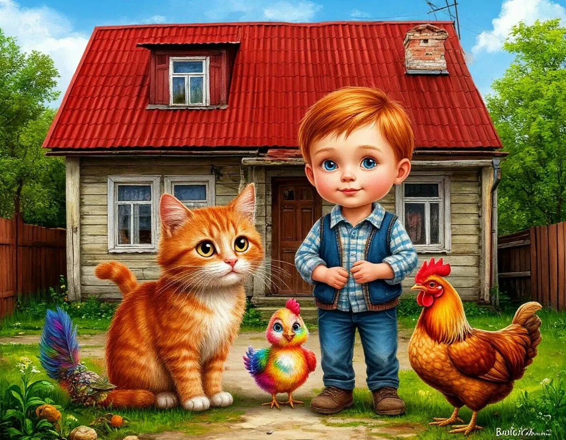 Вовка жил с бабушкой в маленьком домике с красной крышей. Во дворе жили его верные друзья: рыжий кот Барсик, который умел подмигивать одним глазом, пёстрая курица Клара, любившая напевать песенки, и старый мудрый пёс Бублик, который знал все деревенские новости.
