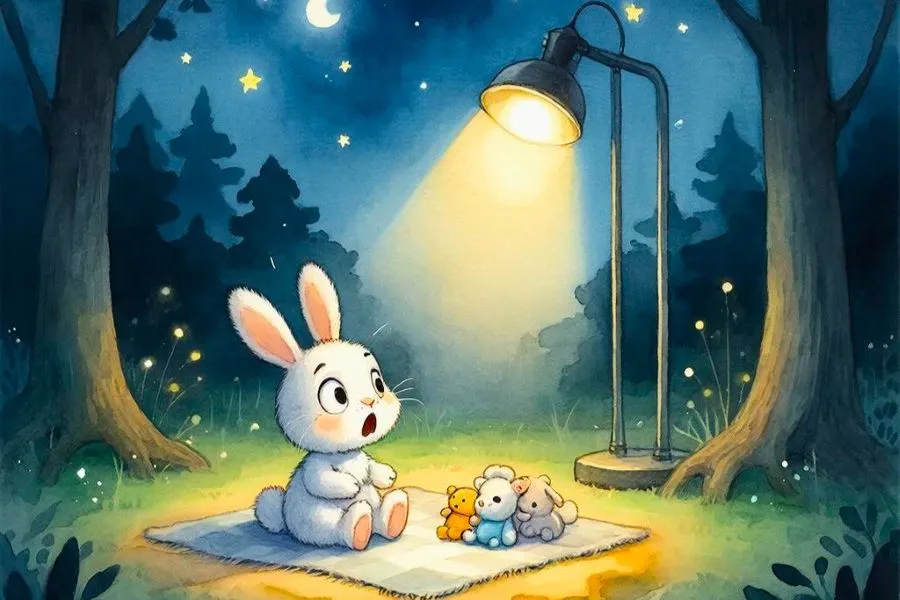 Светлячок зажег свой фонарик, и вокруг стало немного светлее. Ушастик увидел, что в темноте тоже есть красота: мерцающие звезды, тихий шелест листьев, мягкое свечение луны.